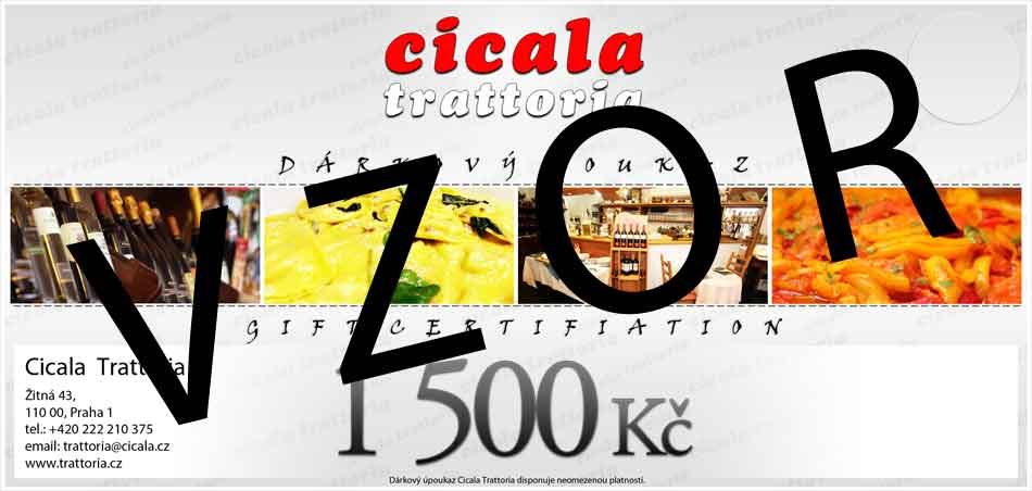 | Rádi byste obdarovali své blízké netradičním dárkem a nevíte jak na to? Chcete darovat milou pozornost svému obchodnímu partnerovi a nevíte si rady? Věnujte jim jeden z našich dárkových poukazů Trattoria Cicala. |